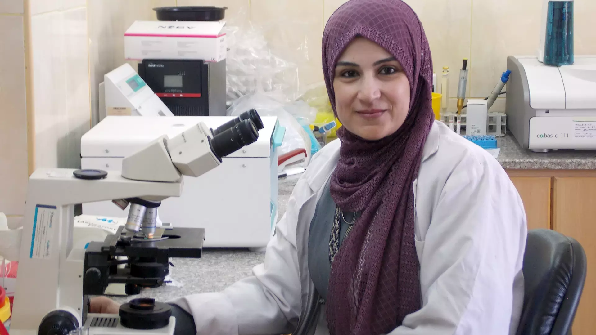 Abeer, a Lab Technician, works at the mother and child section of the Al Husun Health Center in Irbid, northern Jordan. The facility is supported by the USAID Health Services Quality Accelerator Activity. Photo credit: URC